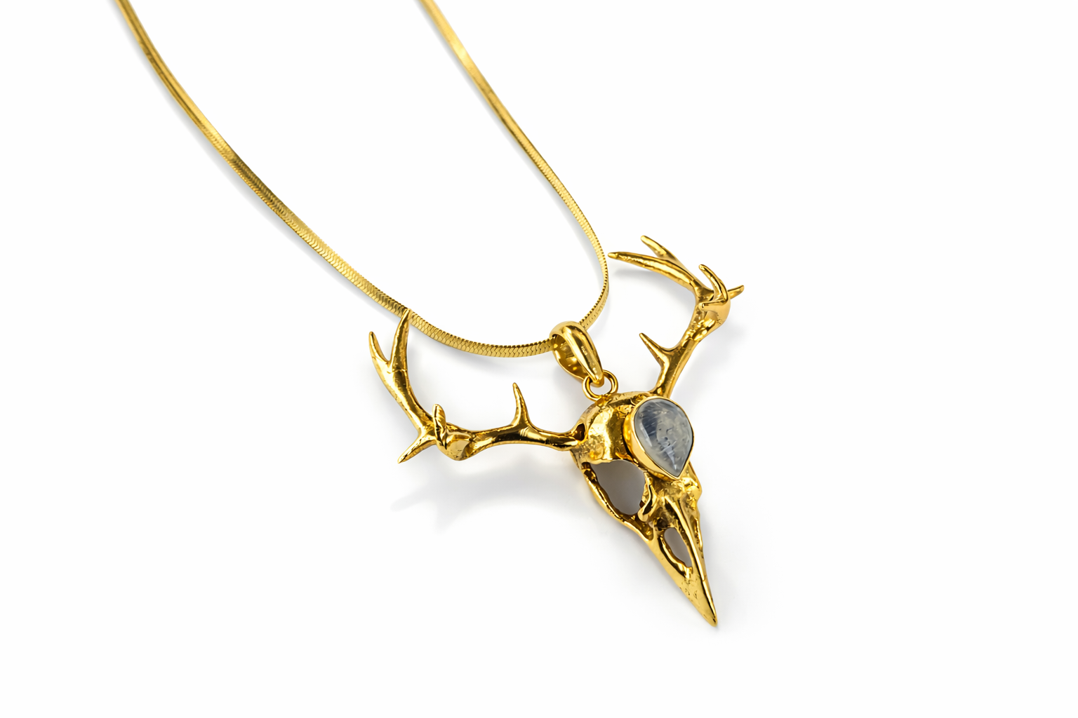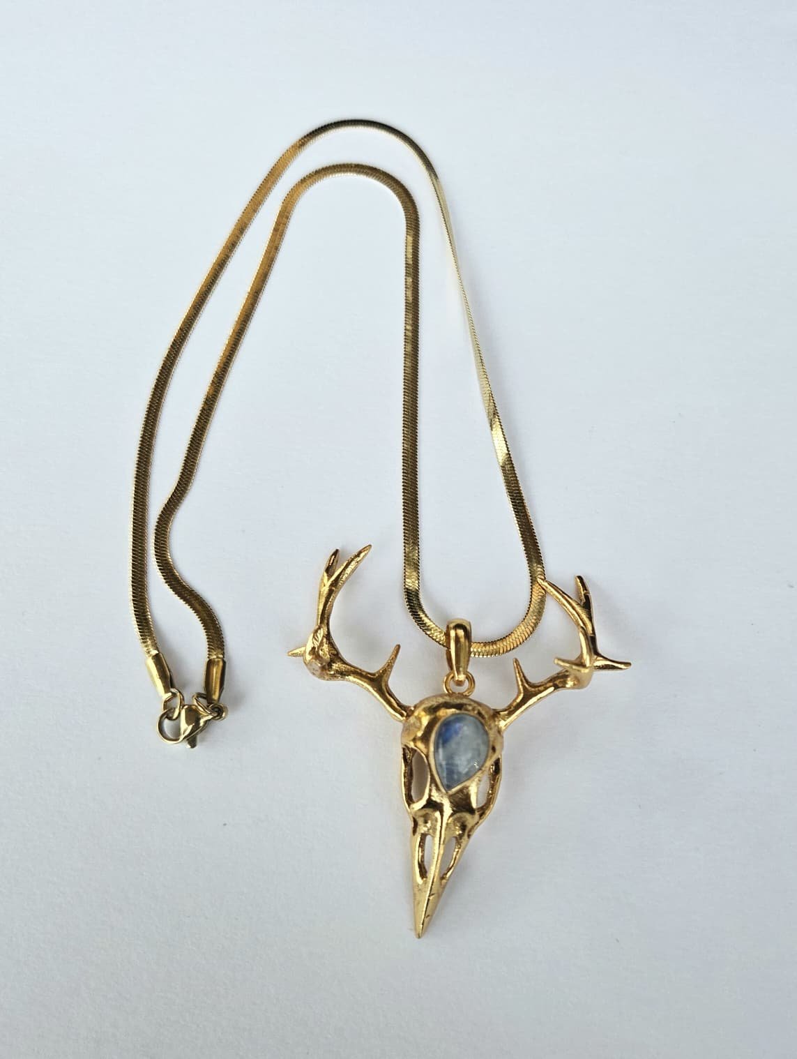 Elevate your style with our Handmade Bird Skull Necklace, a stunning piece of jewelry that blends artistry and sophistication. Adorned with a shimmering moonstone and wrapped in 18K gold-plated brass, this necklace is meticulously crafted to make a bold yet elegant statement.
