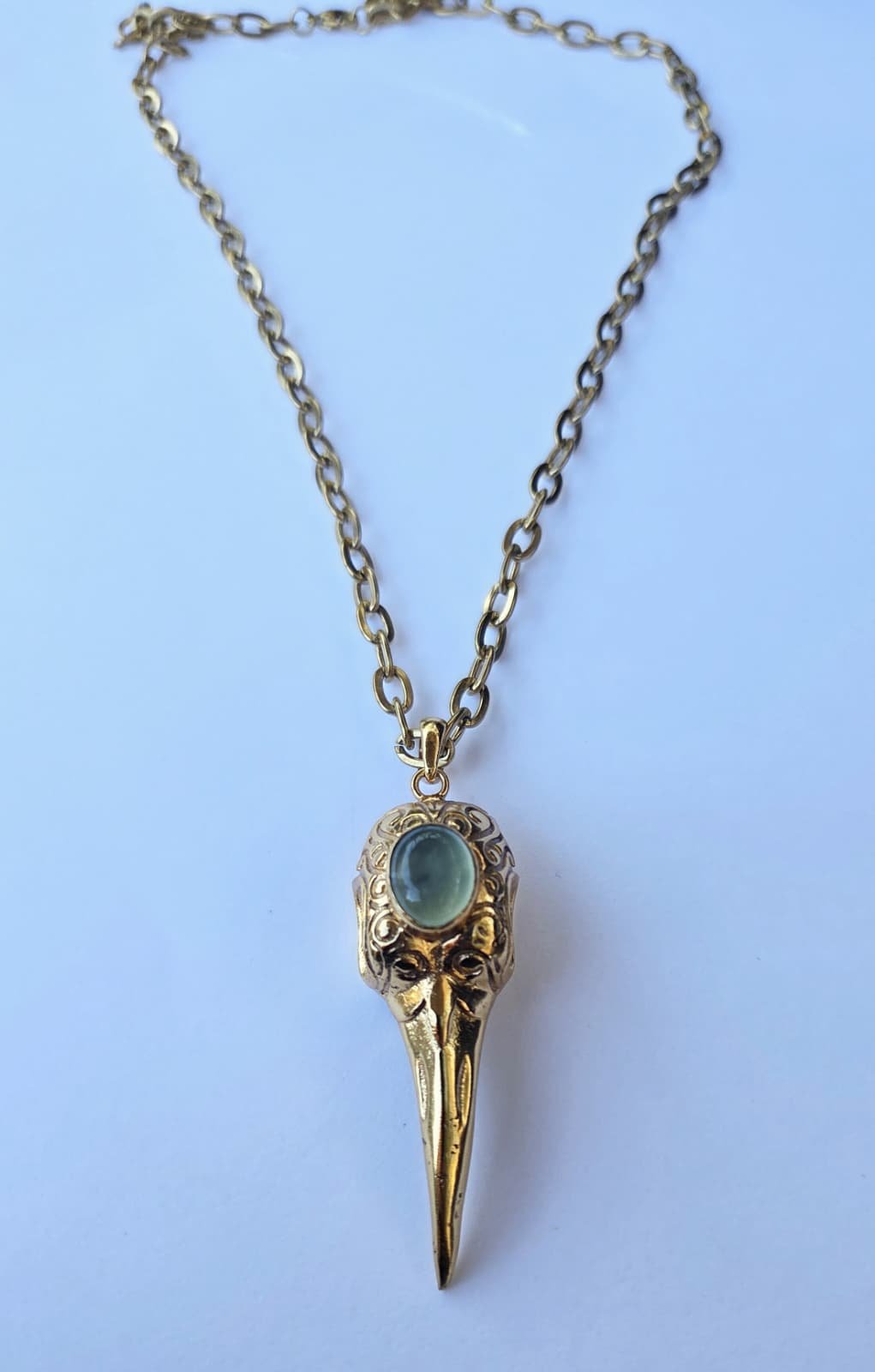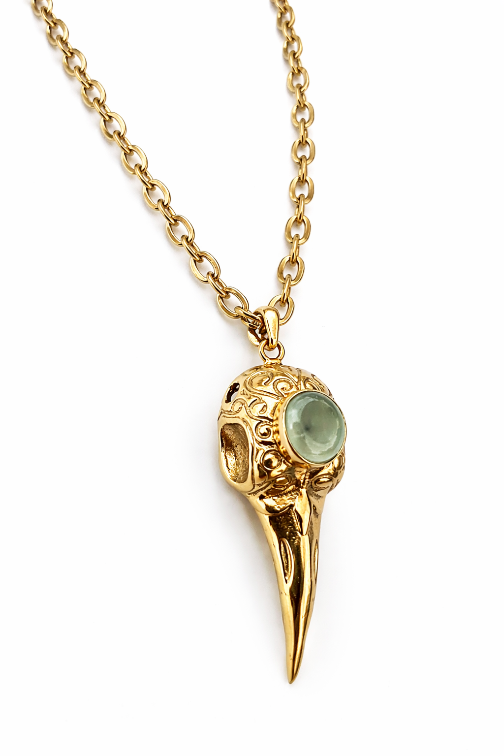 Discover the exquisite Handmade Skull Bird Necklace—a true blend of artistry and elegance. Featuring a meticulously crafted design, this necklace stands out for its stunning details and unique charm. Made with natural Prinithe Stone and 18k Gold Plated Brass, it complements any look effortlessly while maintaining a touch of sophistication.
