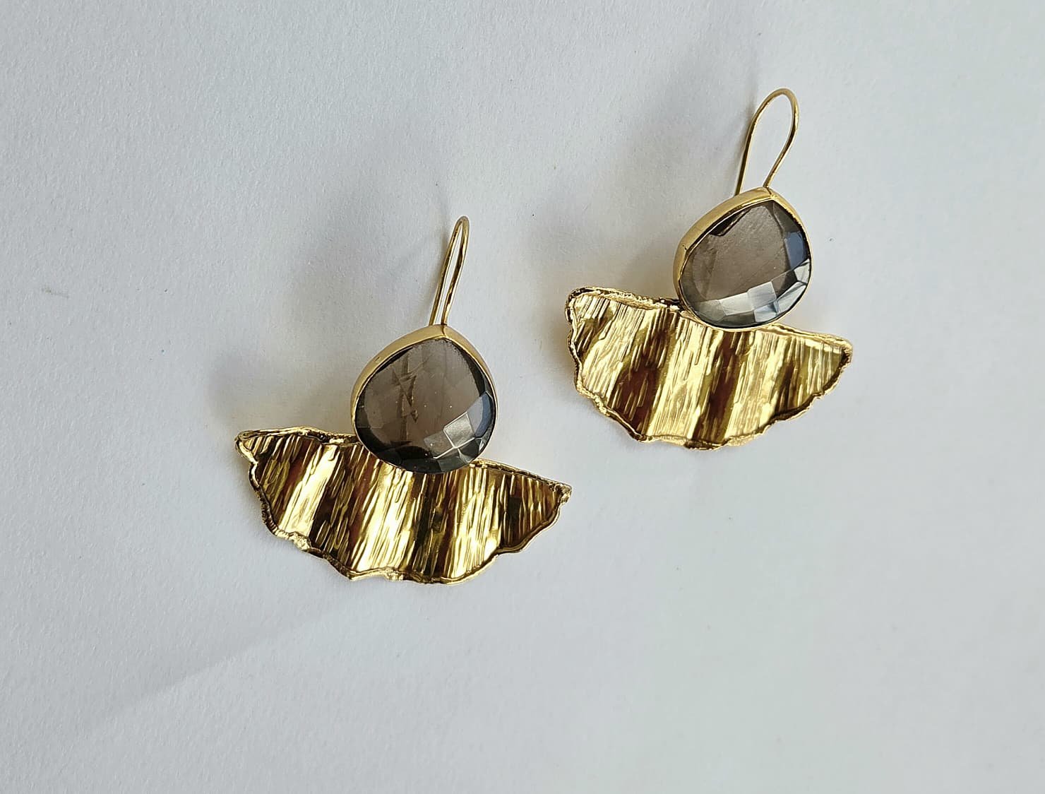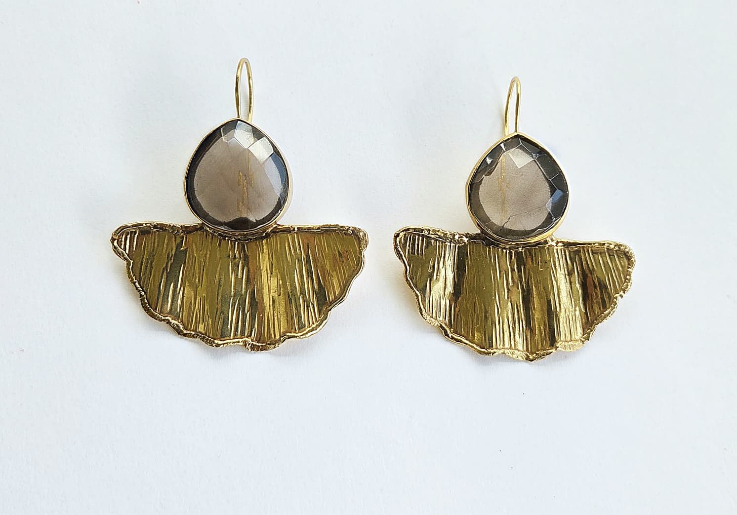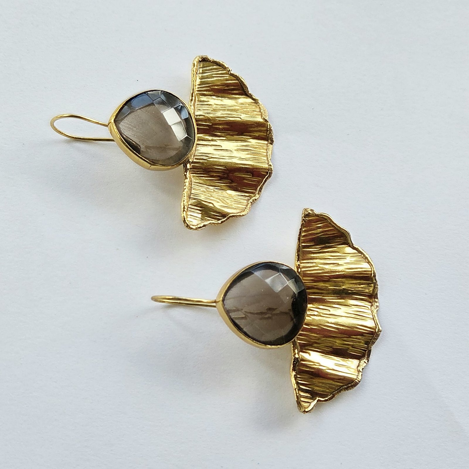 These Handmade Fun Earrings feature faceted Smokey Quartz stones paired with 18k Gold Plated Brass. Meticulously crafted, they bring a touch of elegance to your everyday style without compromising on comfort or durability.