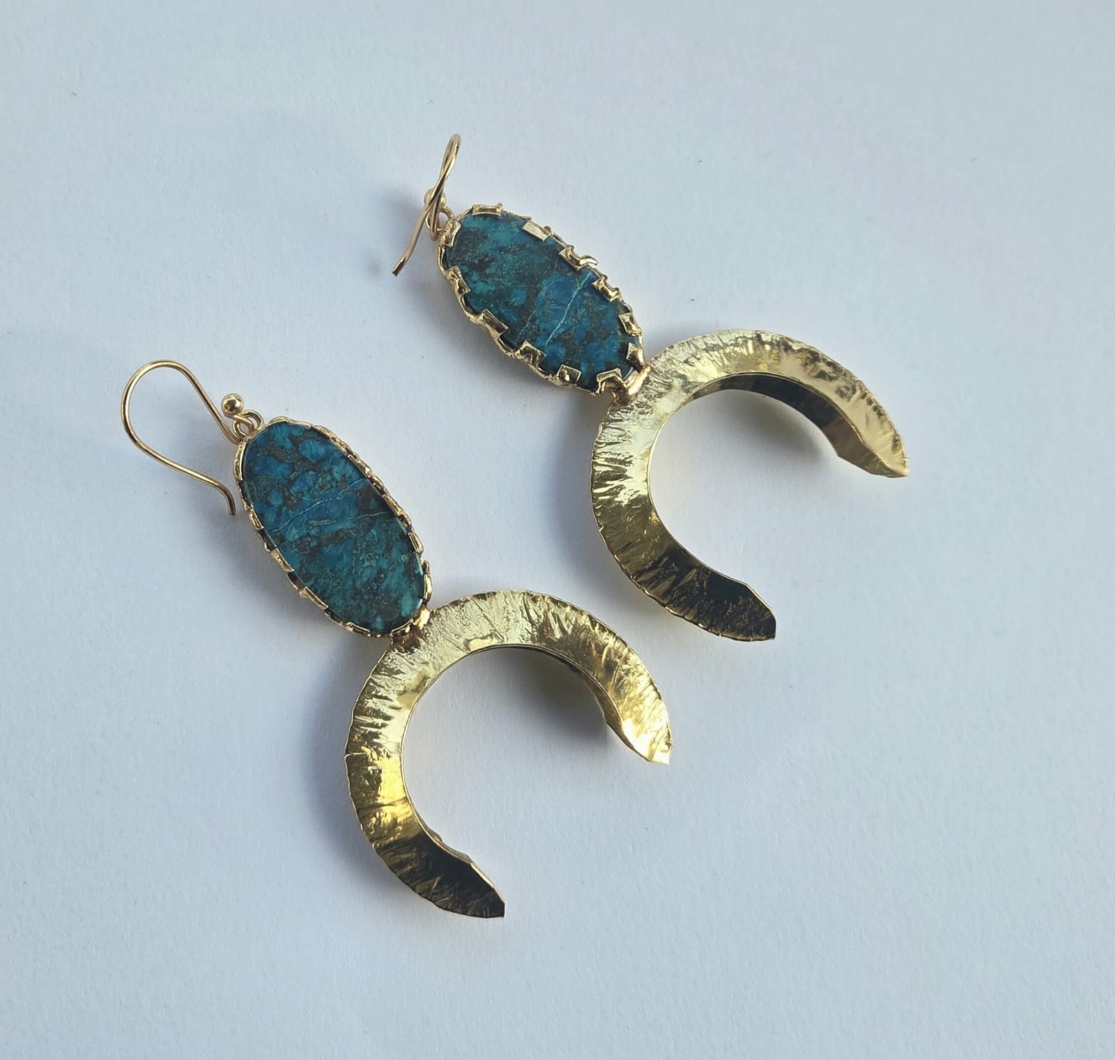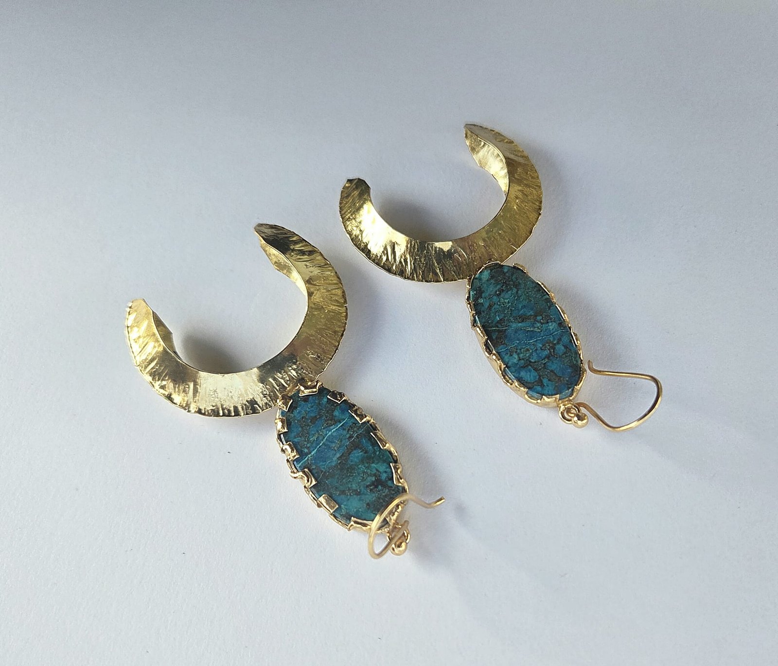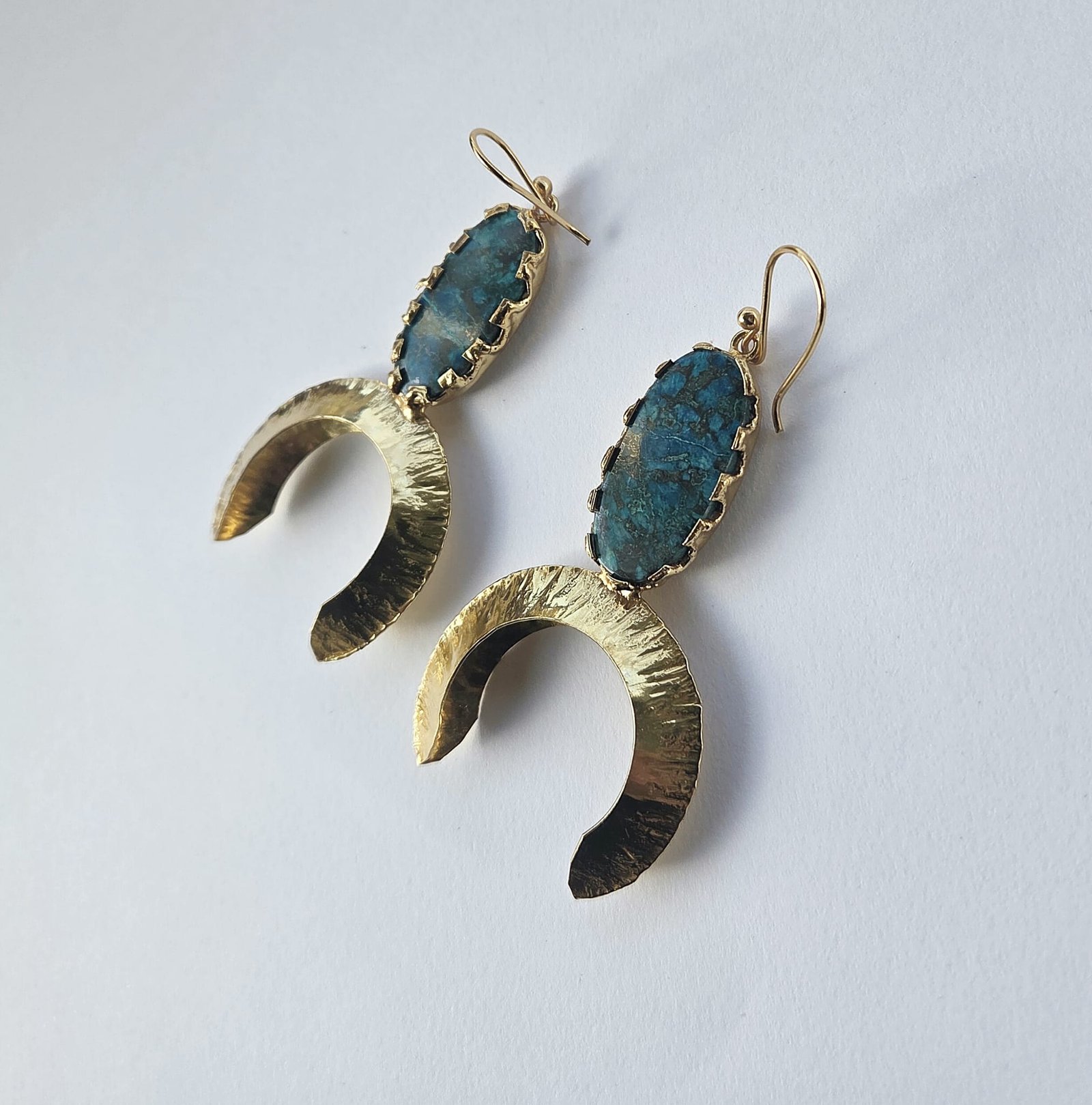 These handmade inverted moon earrings combine artisanal craftsmanship with a striking natural Azurite Malachite stone, known for its deep blue and green natural patterns. Each stone is unique, making every pair one of a kind.
