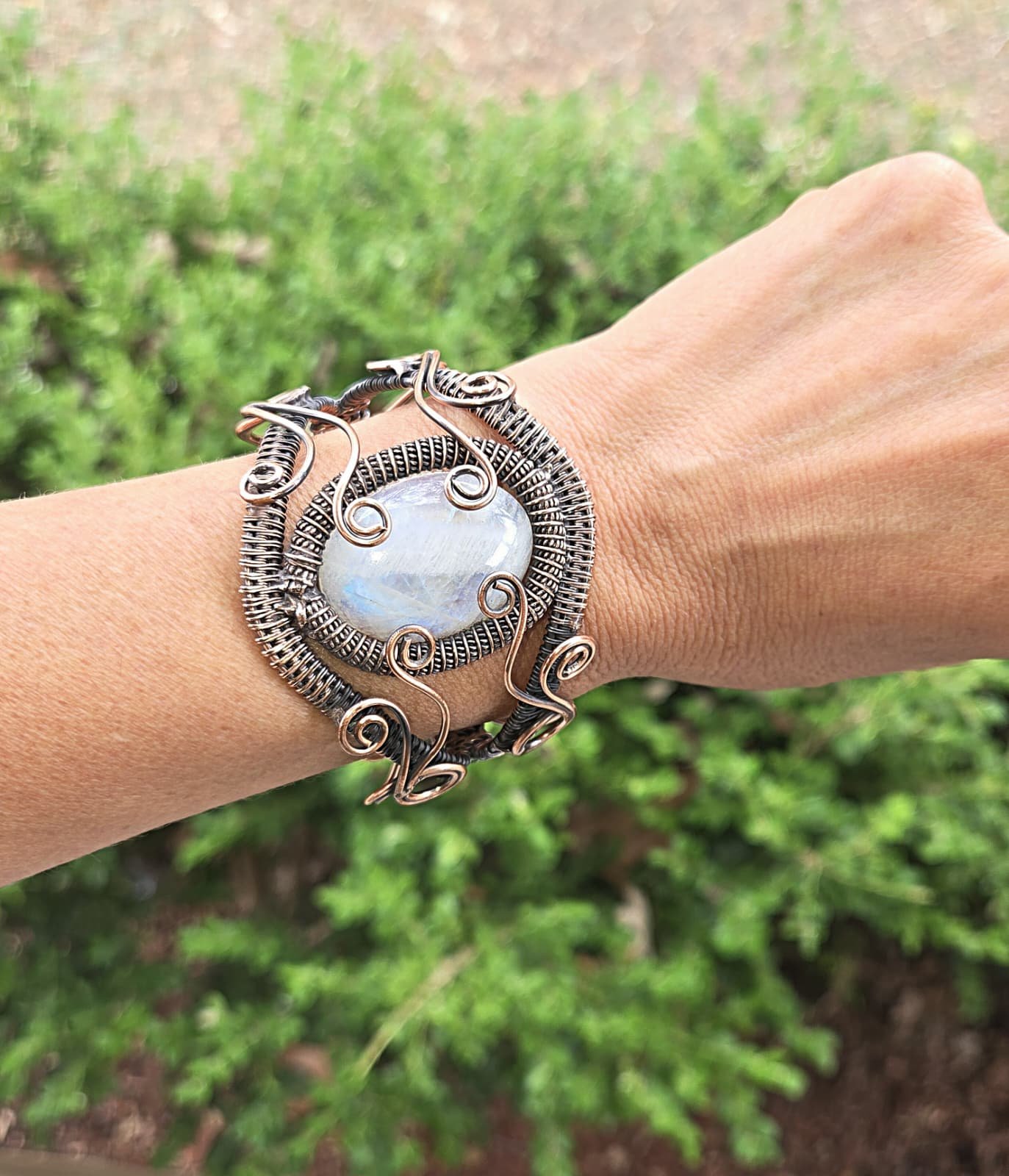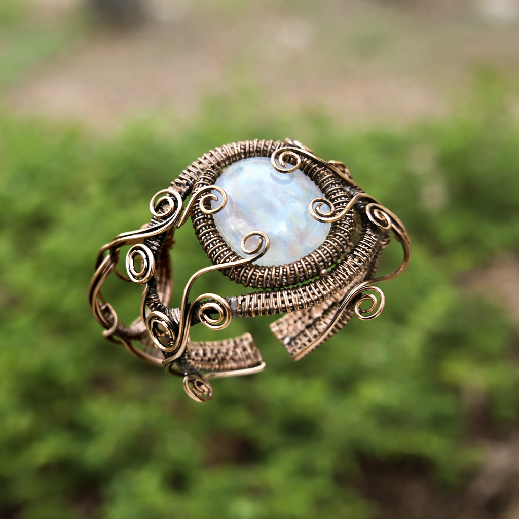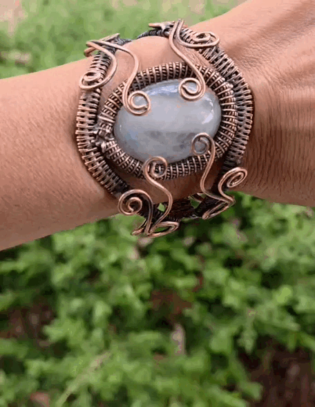This handcrafted wire-wrapped bracelet is made from solid copper and features a luminous natural moonstone at its center. Each piece is carefully shaped by hand, creating an organic and elegant design. Fully adjustable for a comfortable fit, nickel-free, and perfect for everyday wear or special occasions.